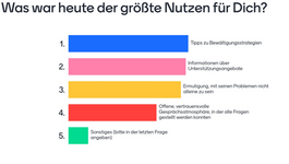 Was jedoch als der größte Nutzen wahrgenommen wurde und auch im Alltag sehr wichtig ist, ist die Ermutigung seine Probleme zu kommunizieren und zu wissen, dass man mit ihnen nicht allein ist oder allein sein muss.
